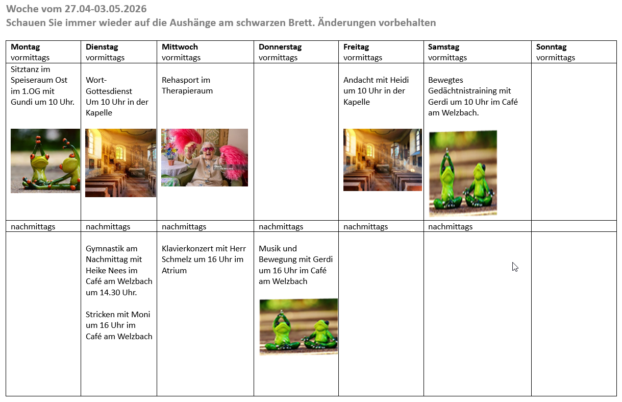 Ihren Alltag können Sie bei uns weitestgehend selbst bestimmen und aus vielen zusätzlichen Angeboten wählen. Dazu zählen unter anderem unsere Bibliothek mit Lesegerät, das Café am Welzbach und ein Friseursalon. In unserer hauseigenen Kapelle werden regelmäßig Gottesdienste gefeiert.