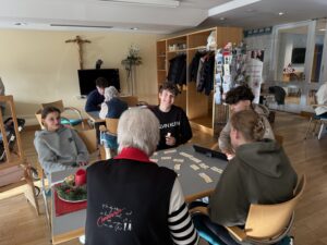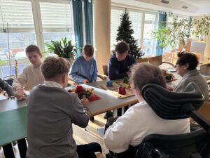 Im Rahmen ihrer weihnachtlichen Besinnungstage besuchten Schülerinnen und Schüler der Realschule Großostheim gemeinsam mit ihrer Lehrerin Frau Cornelia Bürkel unsere Bewohnerinnen und Bewohner. Die Jugendlichen hatten verschiedene Karten- und Bewegungsspiele im Gepäck und sorgten damit für viel Freude und Abwechslung im Alltag.