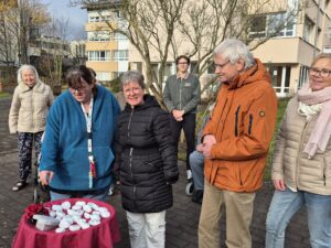 In einer kleinen, würdevollen Mini-Prozession machten sich Bewohnerinnen, Bewohner und Mieter gemeinsam mit dem Begleitteam auf den Weg in den Garten. Dort wurden die Gedenksteine feierlich übergeben. Sozialdienstmitarbeiterin Stefanie Rudolf, unsere ehrenamtliche Mitarbeiterin Heidi Erhardt sowie Jutta Kroth vom Projekt Schmetterlingsflug verlasen zu jedem Stein den Namen der verstorbenen Person, bevor der Stein seinen Platz im Gabionenherz fand.